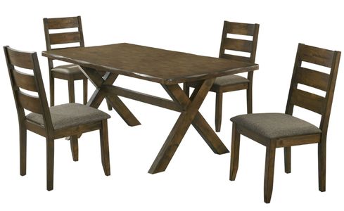 Rustic warmth and timeless craftsmanship define this inviting dining collection. Built from solid rubberwood in a knotty nutmeg finish, each piece showcases organic wood grains and hand-planed edges that lend a handcrafted feel. The rectangular table’s trestle-style X-base adds a modern farmhouse touch, while the ladder-back chairs feature padded fabric seats for everyday comfort.Read More