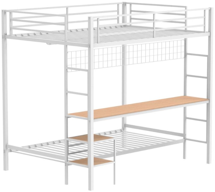 Full-over-twin bunk bed in matte white powder-coated metal with integrated modern design