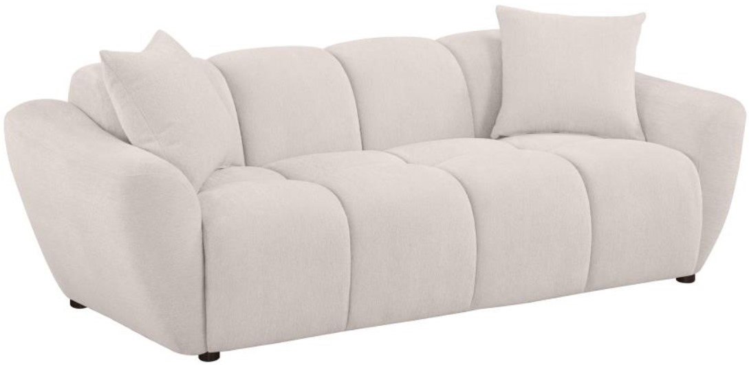 Bold and sculptural, this modern sofa showcases wide splayed arms that frame a grid-tufted silhouette with striking definition. Upholstered in textured greige chenille, its block-like contours are accentuated by deep channel detailing and an attached waterfall seat.Read More