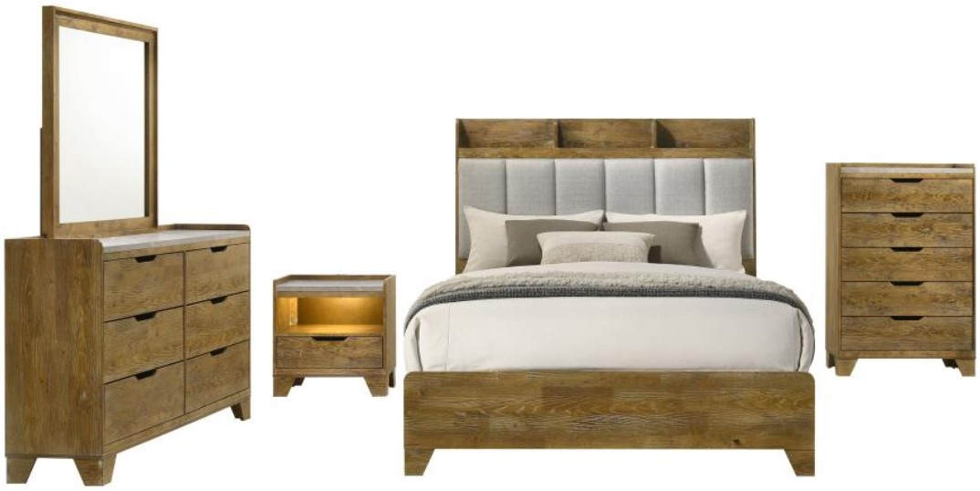 Bringing together the warmth of rustic woodgrain and the sleekness of modern design, this bedroom set offers a harmonious blend of style and function. Crafted from solid rubberwood with embossed oak grain in a weathered medium oak finish, each piece features thoughtful touches, from faux marble tops to LED lighting and built-in USB charging.Read More