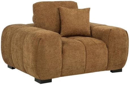 Accent chair in amber fabric features sculptural curves and deep vertical channel tufting