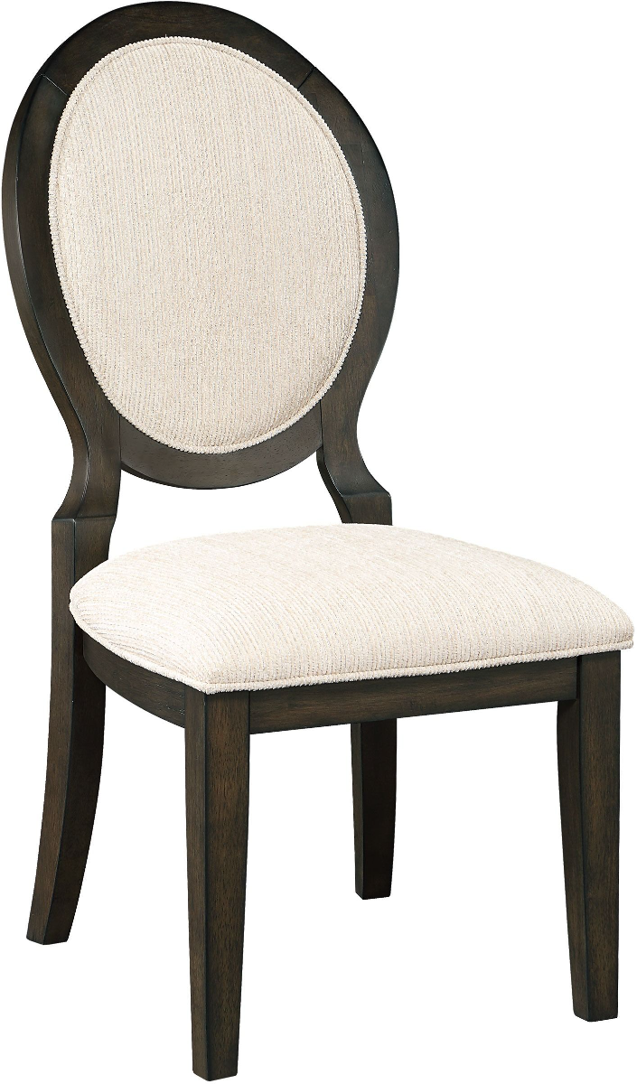 A lovely addition to a dining space, this stunning chair can be slid up to a table for a comfortable place to sit over a long dinner, inviting you to lean back against its padded oval back and padded seats, each wrapped in a cream linen-like fabric with welt trim details. Encasing the padded elements is a rich, dark cocoa finish that lends a bold look. Square tapered legs in front and flared legs in back offer a subtle grace that completes this furniture piece.